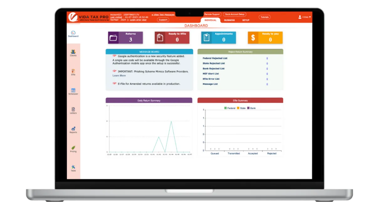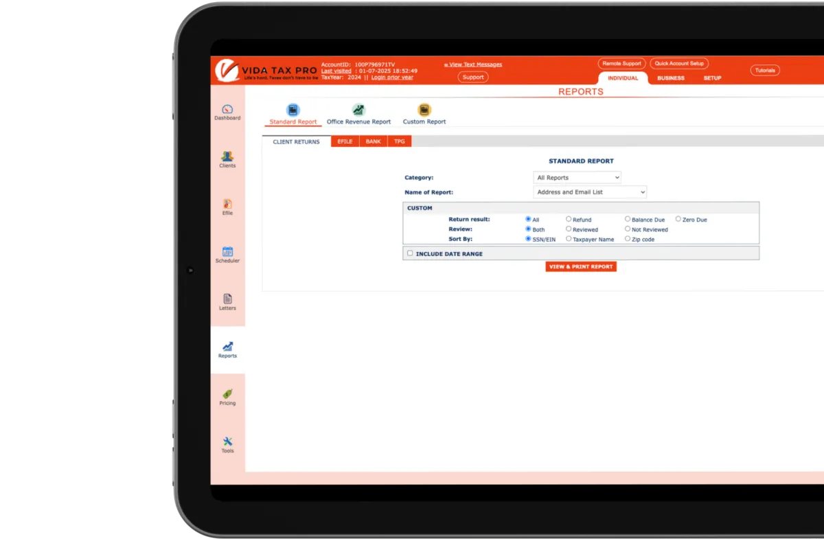 Vida Tax Pro Software's cloud-based software allows you to prepare and file tax returns from any device, providing flexibility and convenience to both you and your customer.